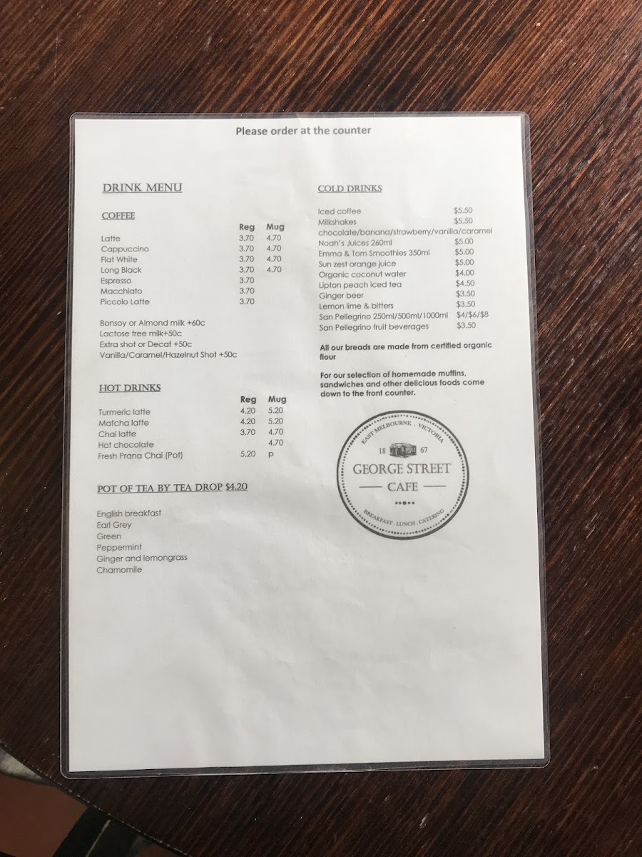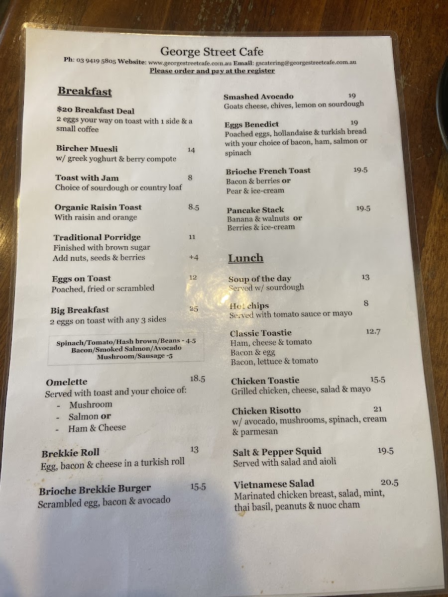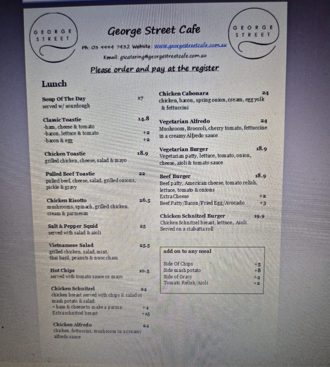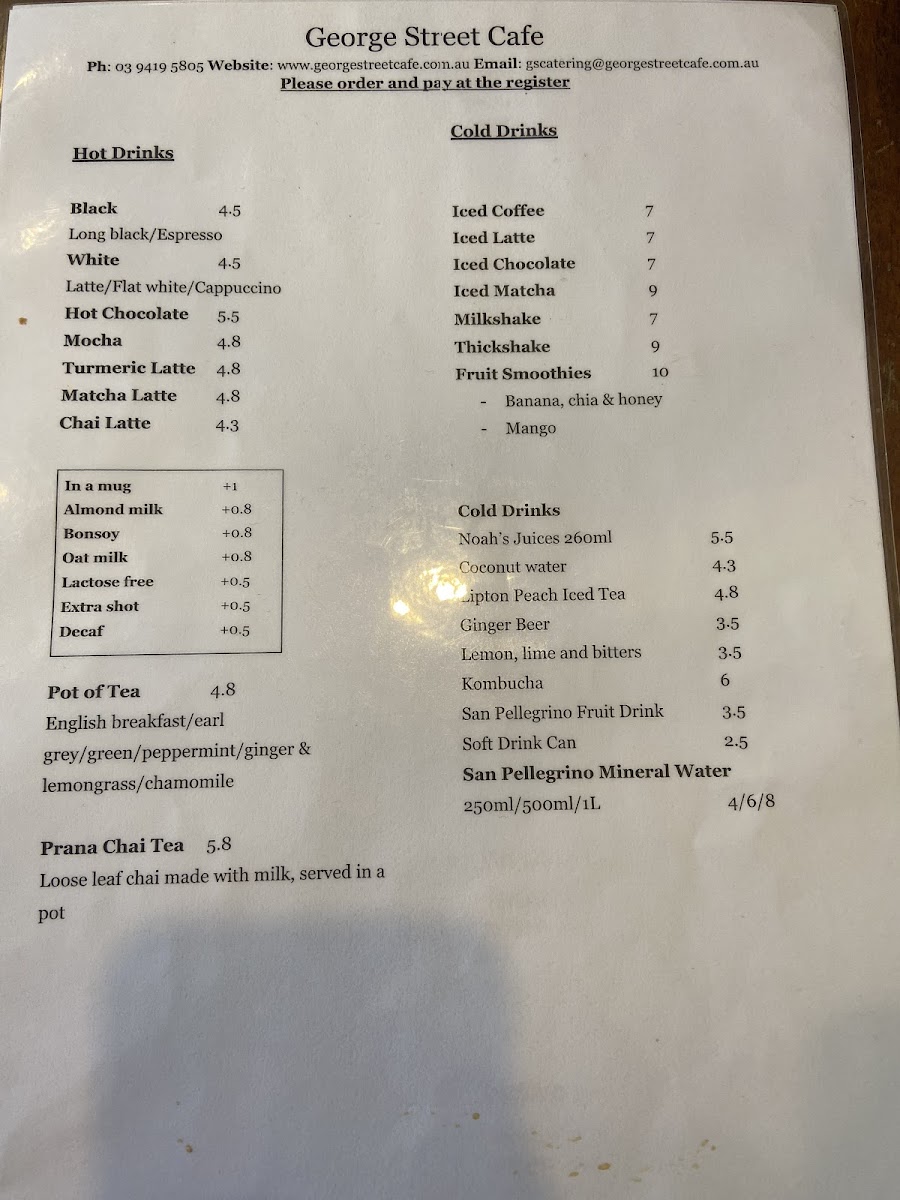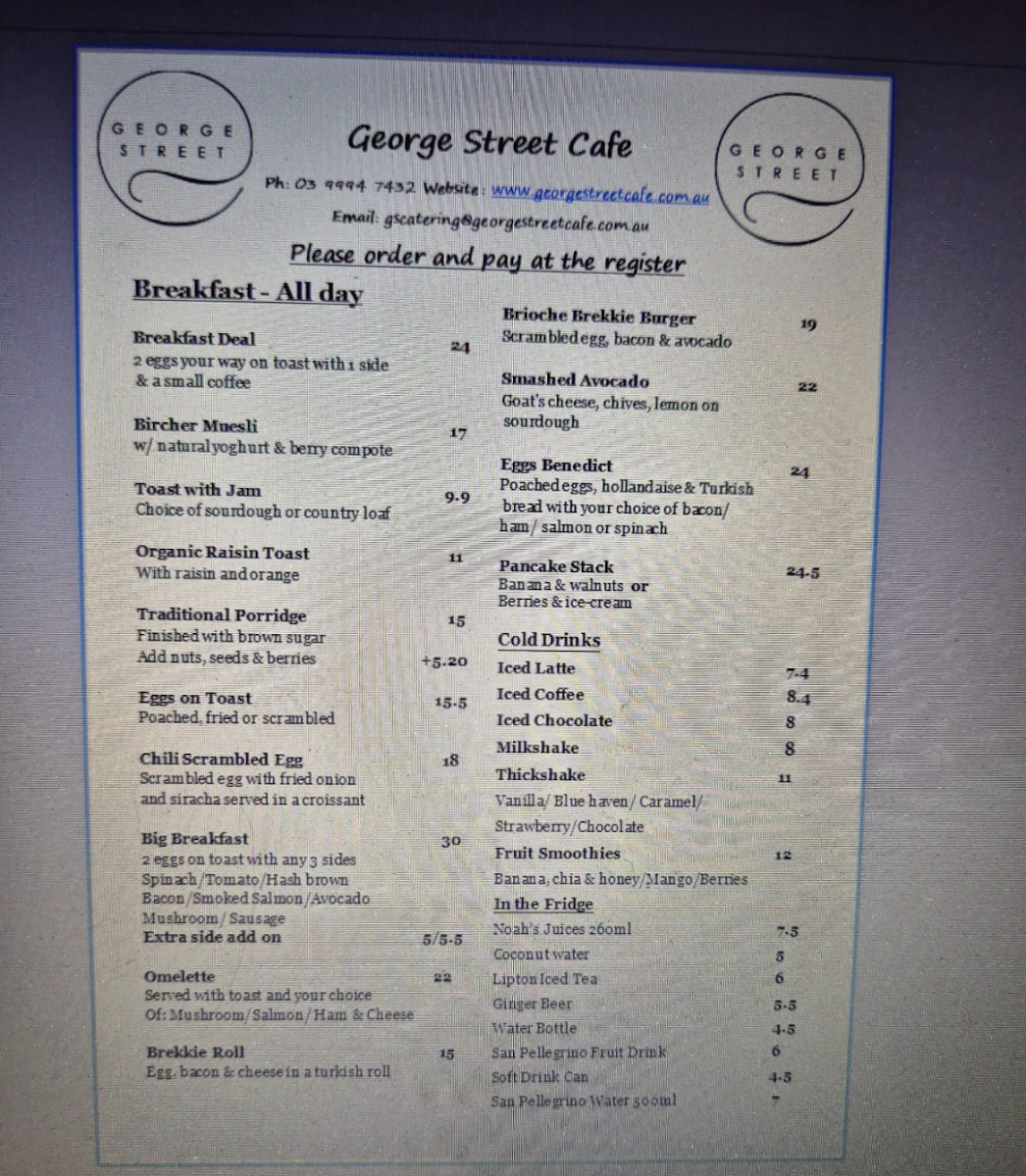 From a reviewer’s perspective, the menu at George Street Cafe, located at 65 George St, East Melbourne VIC 3002, Australia, reflects a well-balanced and approachable all-day dining concept that caters to both locals and visitors. The Breakfast - All Day selection sets a strong foundation with comforting yet satisfying options such as the Brioche Brekkie Burger, the convenient Breakfast Deal, the ever-popular Smashed Avocado, the wholesome Bircher Muesli, and simple classics like Toast with Jam, making it easy to enjoy breakfast at any hour. Moving into lunch, the menu continues with warm and hearty choices including Soup Of The Day, the reliable Classic Toastie, as well as more filling options like Chicken Toastie, Pulled Beef Toastie, and the comforting Chicken Risotto, all suited for a relaxed midday break. To complement the food, the Cold Drinks range offers refreshing café favourites such as Iced Latte, Iced Coffee, Iced Chocolate, along with indulgent options like Milkshake and Thickshake, perfect for Melbourne’s changing weather. For guests on the go, the In the Fridge selection adds extra convenience with bottled choices including Noah’s Juices 260ml, Coconut Water, Lipton Iced Tea, Ginger Beer, and Water Bottle. Overall, the menu at George Street Cafe feels thoughtfully curated, combining all-day breakfast staples, satisfying lunch dishes, and a broad drink selection, making it a reliable and welcoming spot for casual dining in East Melbourne.